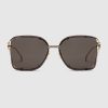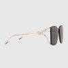 The Pre-Fall 2024 eyewear collection successfully combines the coveted silhouettes of bygone decades with a contemporary logo feel. Here, a shiny rose gold metal frame pairs with a Double G motif.