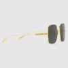 Part of the Pre-Fall 2023, these sunglasses are defined by a 1970s square frame construction. Crafted from gold-toned metal, a Gucci lettering appears along the temples, completing the style with a distinct logo feel.