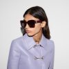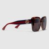 The Cruise 2025 eyewear collection blends a bold silhouette and signature motifs in a contemporary design. These square sunglasses with blue and red temples feature a Gucci logo.