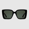 The Cruise 2025 eyewear collection blends a bold silhouette and signature motifs in a contemporary design. These square sunglasses with green and red temples feature a Gucci logo.