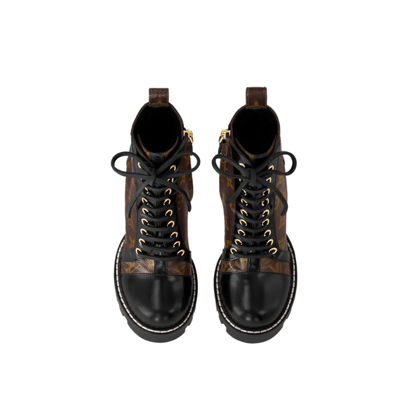 The Star Trail ankle boot, one of Louis Vuitton’s most instantly recognizable designs, is interpreted in patent Monogram canvas for a truly iconic look. Black calf leather trim brings a chic twist to this army-inspired style with its leather laces and rugged platform sole.