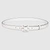 In the Spring Summer collection, women’s belts introduce a round bamboo buckle which coordinates with the ready-to-wear and Gucci Bamboo jewelry pieces. This thin belt in white leather contrasts with an enameled bamboo-shaped buckle.