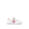 This refined interpretation of the Time Out sneaker comes in soft calf leather, which is discreetly embossed with the LV Initials and Monogram Flowers on the side. A pastel-colored charm featuring the Louis Vuitton Vivienne mascot hangs from an engraved, gold-toned ring. The back of the sneaker is trimmed with the House’s emblematic natural leather.
