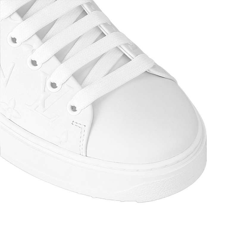 The emblematic Time Out sneaker is revisited in soft calf leather, which is debossed with the Louis Vuitton signature and the Monogram pattern. The design is complemented by a trim in recycled Monogram nylon at the back. This model is finished with an elevated rubber outsole with a 3-D pattern of Monogram Flowers.
