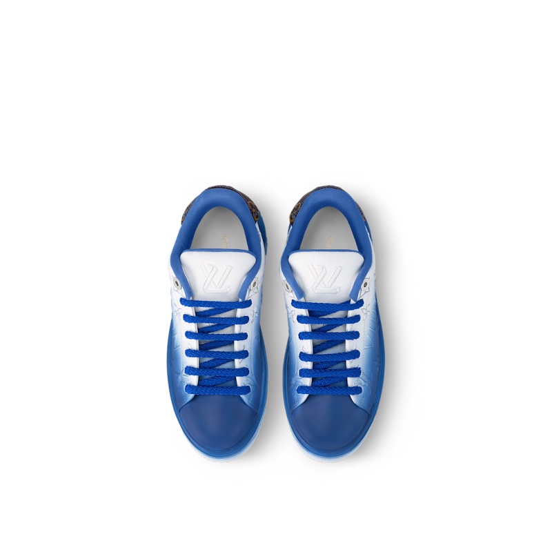 The emblematic Time Out sneaker is reworked this season in soft calf leather, which is debossed with a Monogram pattern with a color fading effect. This richly detailed design also features an oversized Vuitton signature on the side, a LV upcycling logo embroidered on a slightly padded tongue and a thick textile tone on tone laces. Its distinctive elevated, treaded rubber outsole is decorated with a 3-D pattern of Monogram Flowers.
