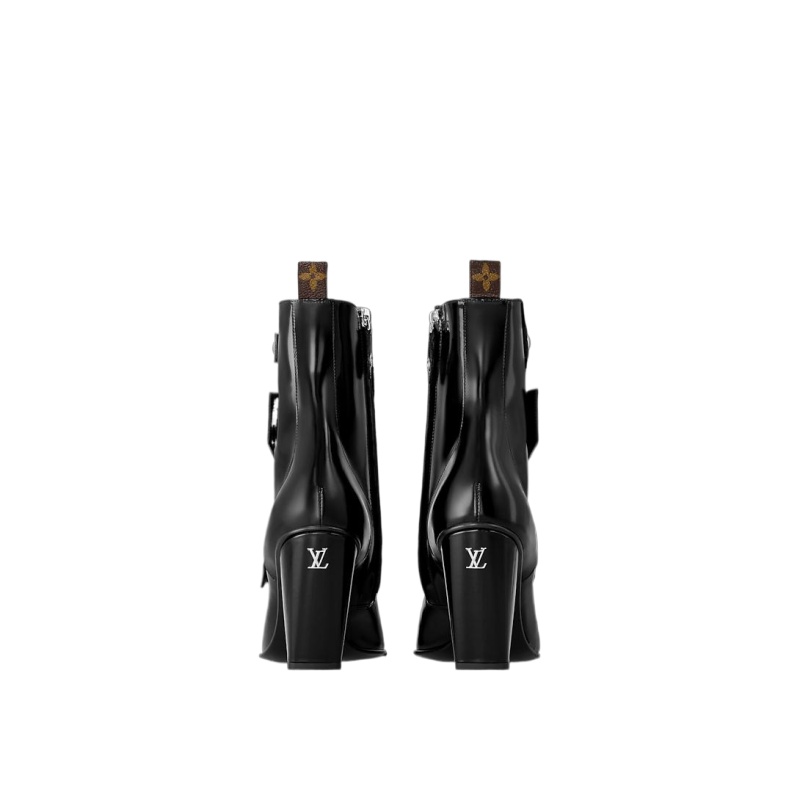 One of the key looks of the Prefall 2024 collection, the Trinity ankle boot comes in glazed calf leather. The elaborately constructed upper is embellished with large, silver-tone studs engraved with the Louis Vuitton signature. This model is finished with a high Cuban heel, while a discreet side zip ensures easy fitting.