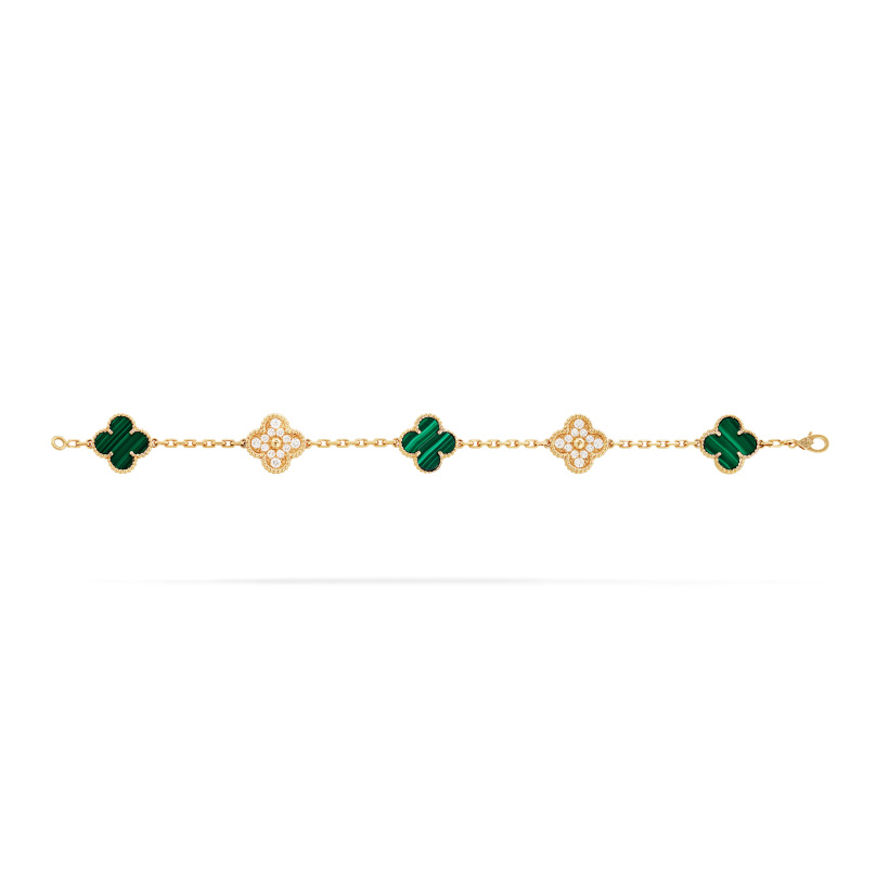 Vintage Alhambra bracelet, 5 motifs, 18K yellow gold, malachite, round diamonds; diamond quality DEF, IF to VVS.