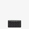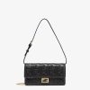Compact Baguette wallet with flap and FF clasp. Interior compartment with six card slots. Double shoulder strap, an adjustable leather option and a detachable thin chain option: to carry the bag like a clutch, under the arm or wear it cross-body. Made of black nappa leather with embossed FF motif. Gold-finish metalware.