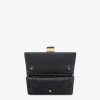 Compact Baguette wallet with flap and FF clasp. Interior compartment with six card slots. Double shoulder strap, an adjustable leather option and a detachable thin chain option: to carry the bag like a clutch, under the arm or wear it cross-body. Made of black nappa leather with embossed FF motif. Gold-finish metalware. Made in Italy