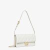 Compact Baguette wallet with flap and FF clasp. Interior compartment with six card slots. Double shoulder strap, an adjustable leather option and a detachable thin chain option: to carry the bag like a clutch, under the arm or wear it cross-body. Made of shiny, white nappa leather with a three-dimensional, embossed diagonal FF motif. Gold-finish metalware.