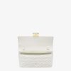 Compact Baguette wallet with flap and FF clasp. Interior compartment with six card slots. Double shoulder strap, an adjustable leather option and a detachable thin chain option: to carry the bag like a clutch, under the arm or wear it cross-body. Made of shiny, white nappa leather with a three-dimensional, embossed diagonal FF motif. Gold-finish metalware. Made in Italy