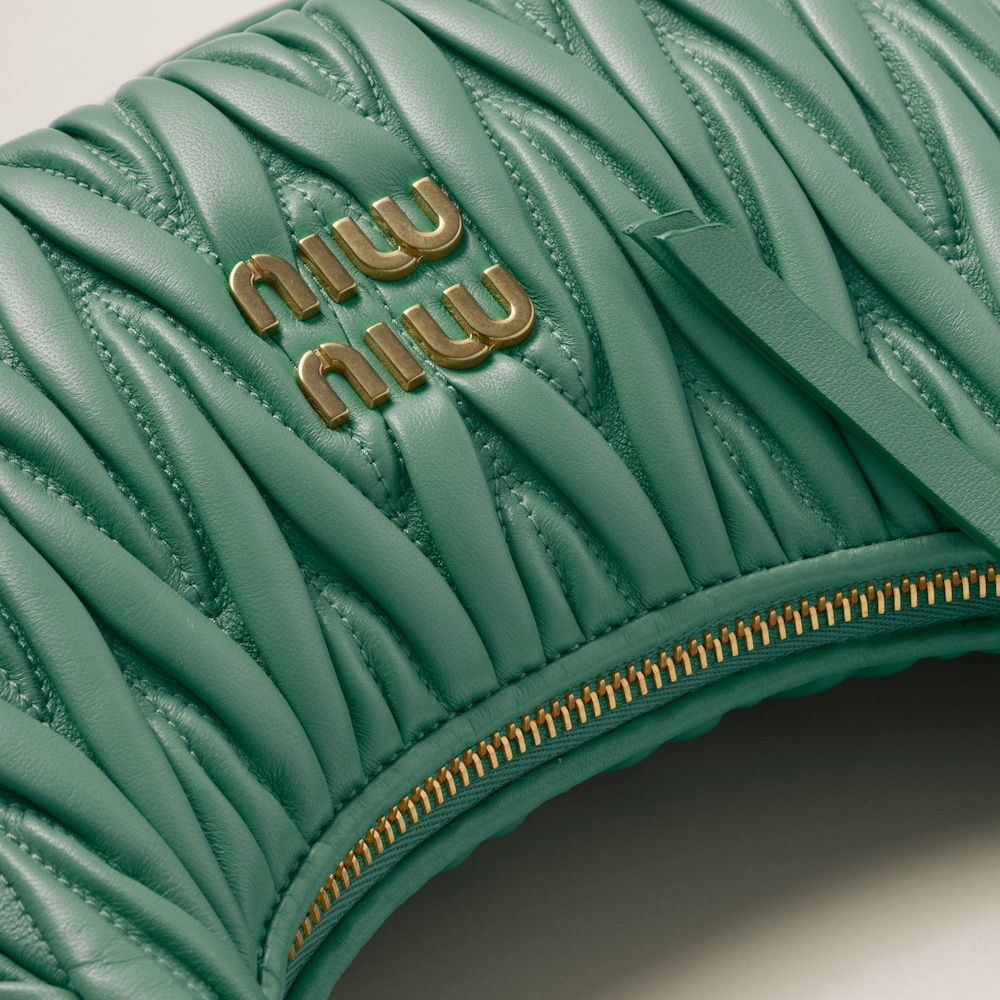 The Wander bag is reinterpreted season after season, becoming an iconic accessory of Miu Miu collections. Made of matelassé nappa leather, the bag is characterized by the sophisticated, three-dimensional effect created by the refined workmanship. The hobo shape, blending retro inspirations and contemporary elegance, becomes a new synonym of modern femininity.