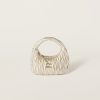 The Wander bag is reinterpreted season after season, becoming an iconic accessory of Miu Miu collections. Made of matelassé nappa leather, the bag is characterized by the sophisticated, three-dimensional effect created by the refined workmanship. The hobo shape, blending retro inspirations and contemporary elegance, becomes a new synonym of modern femininity.