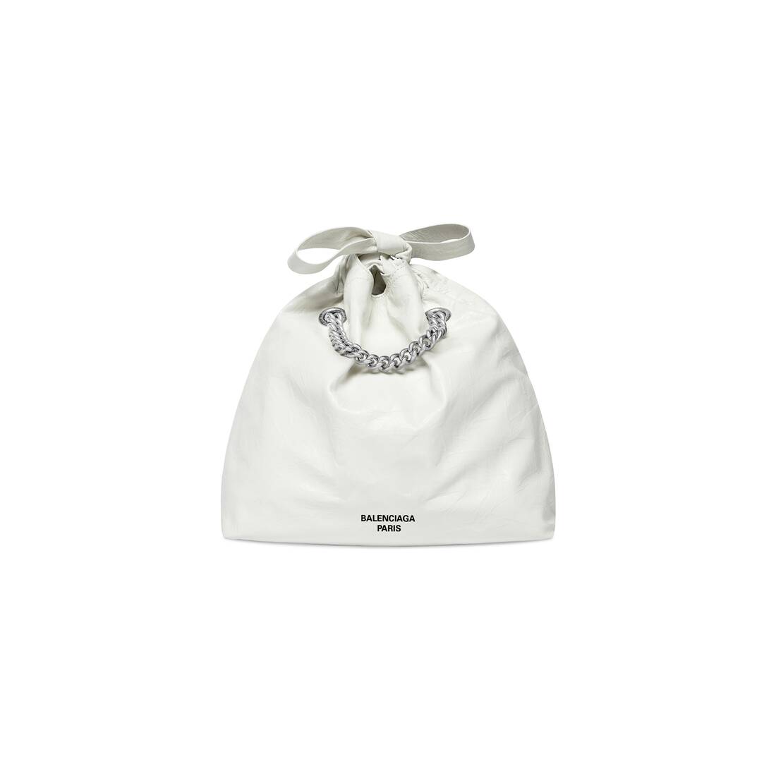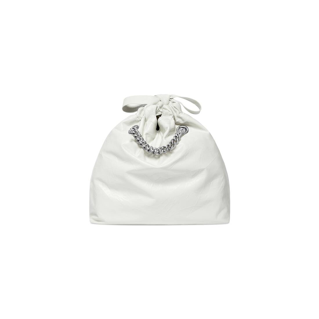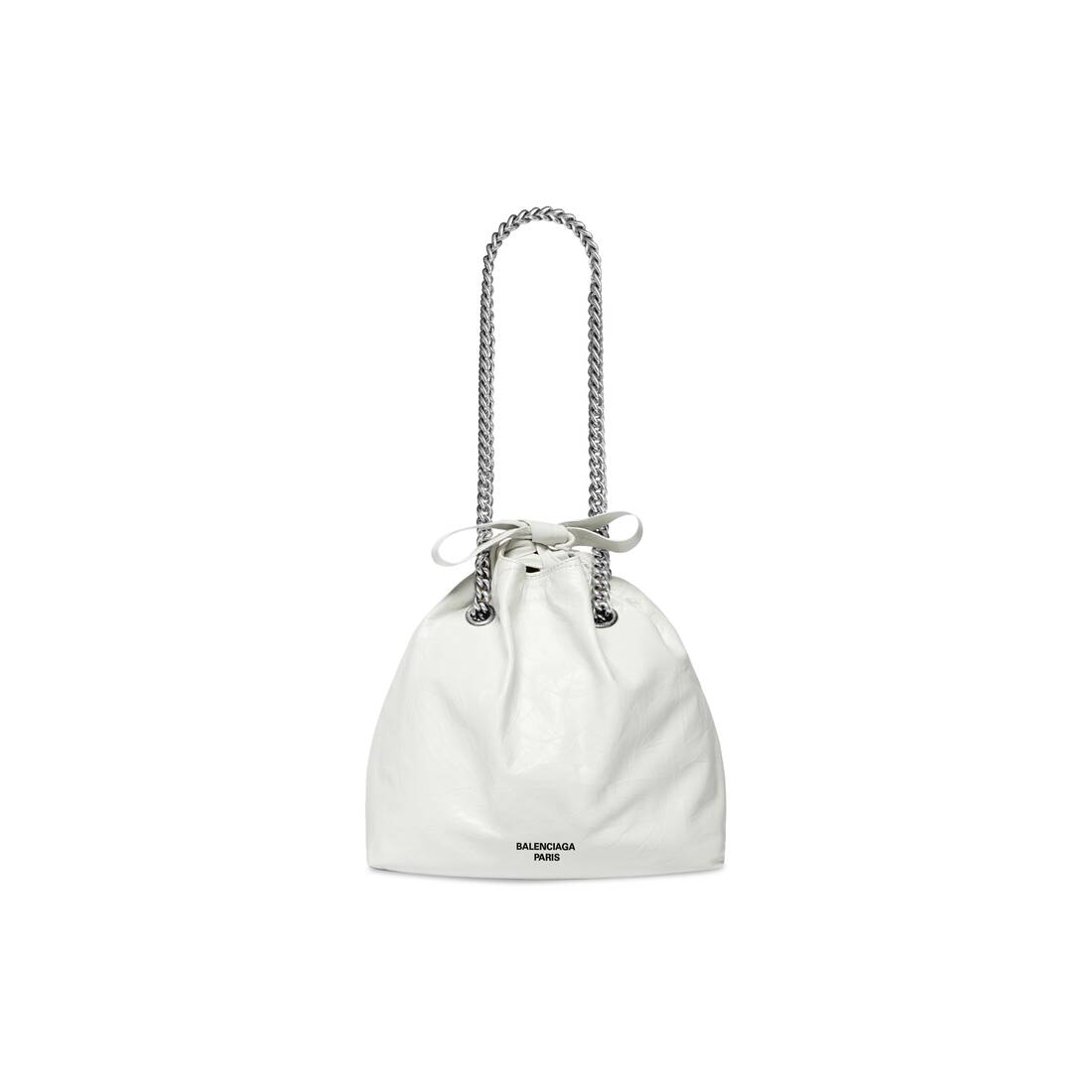 • Dimensions: L9,4 x H10,2 x W3,9 inch • Crushed calfskin • Tote bag • Shoulder and crossbody chain strap (8,6 inch) • Balenciaga Paris logo printed at front • Aged-silver hardware • Drawstring closure • 1 inner zipped pocket • Cotton canvas lining • Made in Italy