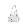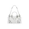 • Dimensions: L13 x H8,2 x W5,3 inch • Arena lambskin • Trapezoidal shape • Two leather hand-braided handles • Adjustable and removable strap (16,5 inch) • Aged-silver hardware • Zipped closure with knotted leather puller • Front zipped pocket with knotted leather puller • 1 inner zipped pocket • 1 removable zipped pouch • 1 removable heart mirror • Tone-on-tone Balenciaga logo embossed on mirror • Cotton canvas lining • Made in Italy
