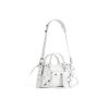 • Dimensions: L10,2 x H7 x W4,5 inch • Arena lambskin • Trapezoidal shape • Two leather hand-braided handles • Adjustable and removable strap (19,6 inch) • Aged-silver hardware • Zipped closure with knotted leather puller • Front zipped pocket with knotted leather puller • 1 inner zipped pocket • 1 removable zipped pouch • 1 removable heart mirror • Tone-on-tone Balenciaga logo embossed on mirror • Cotton canvas lining • Made in Italy