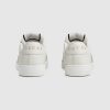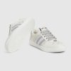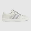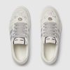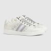 Influenced by classic sneakers from the ’70s, the Screener sneakers—named for the defensive sports move—feature the Web stripe on the side and the vintage Gucci logo. Here the style is reimagined in grey leather and white GG Crystal canvas, while a grey and white glittery Web completes the style.