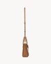 This piece may be carried as a handbag or worn crossbody with an adjustable and detachable strap.